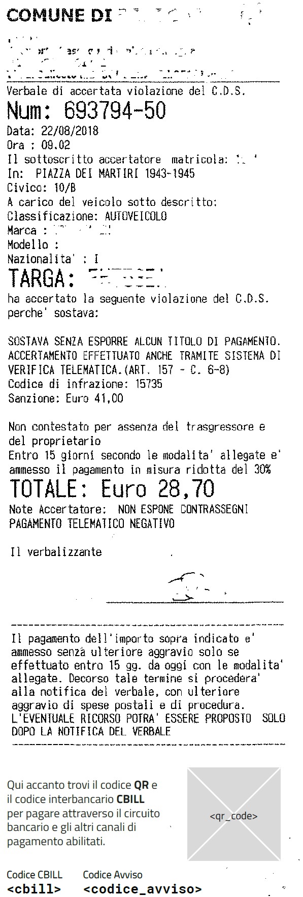 abbiamo aggiunto in fondo il QR code per il pagamento da mobile o con sportello fisico; ovviamente il documento non ha un formato A4 e non ci può essere il codice per il pagamento presso le Poste; in ogni caso, la persona può anche accedere al portale web del Comune e scaricare l’avviso di pagamento “classico” (nel formato previsto da AGID), nel caso voglia pagare con questa modalità.