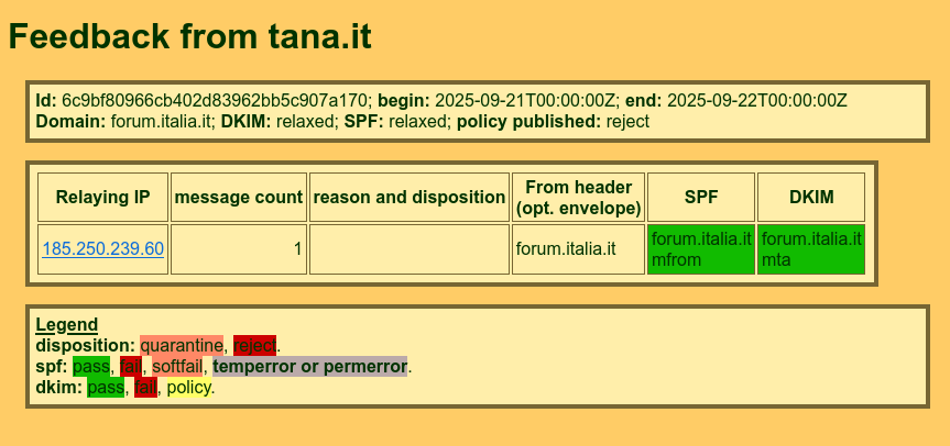 DMARC prevede un meccanismo di feedback aggregato. Le mail [Forum Italia] Riepilogo spedite da forum.italia.it sono soggette ad aggregazione, inviano un messaggio di ricezione come questo: