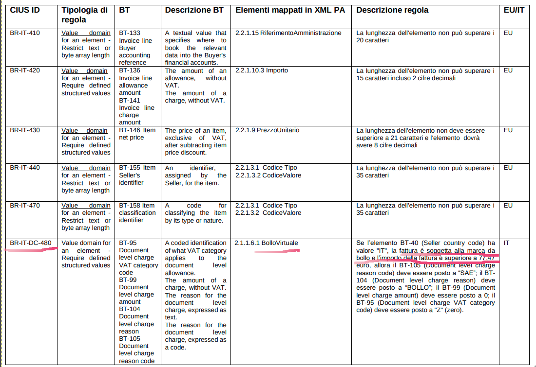 Lo standard europeo EN 16931 permette l’integrazione di estensioni nazionali (chiamate CIUS, Core Invoice Usage Specifications, nel caso nostro si chiama CIUS-IT), per gestire delle peculiarità nazionali (ad esempio l’imposta di bollo che in Italia si applica a molti documenti come ad esempio alcune tipologie di fatture senza iva, o anche il CUP o il CIG).
