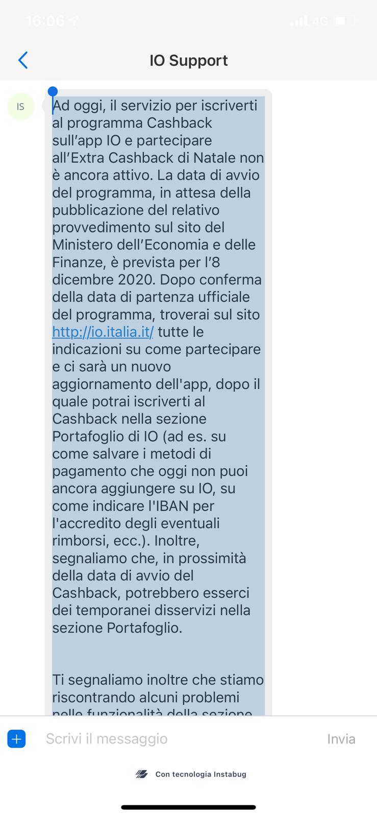 Ho letto e vedo che le problematiche che riscontro in conoscenti sono le stesse ovunque, ma questo gia’ si sapeva. Io ho IOS come sistema operativo e con l’aggiornamento dell’ APP IO ieri mattina, mi ha dato l’aggiornamento della sezione CashBack, non ancora attiva. Ovviamente modifiche apportate al prossimo aggiornamento. La cosa che posso ribadire e’ la disorganizzazione per il testo ed i rilasci di questi tipi di software, i ritardi e i malfunzionamenti che si ribaltano su noi poveri mortali…