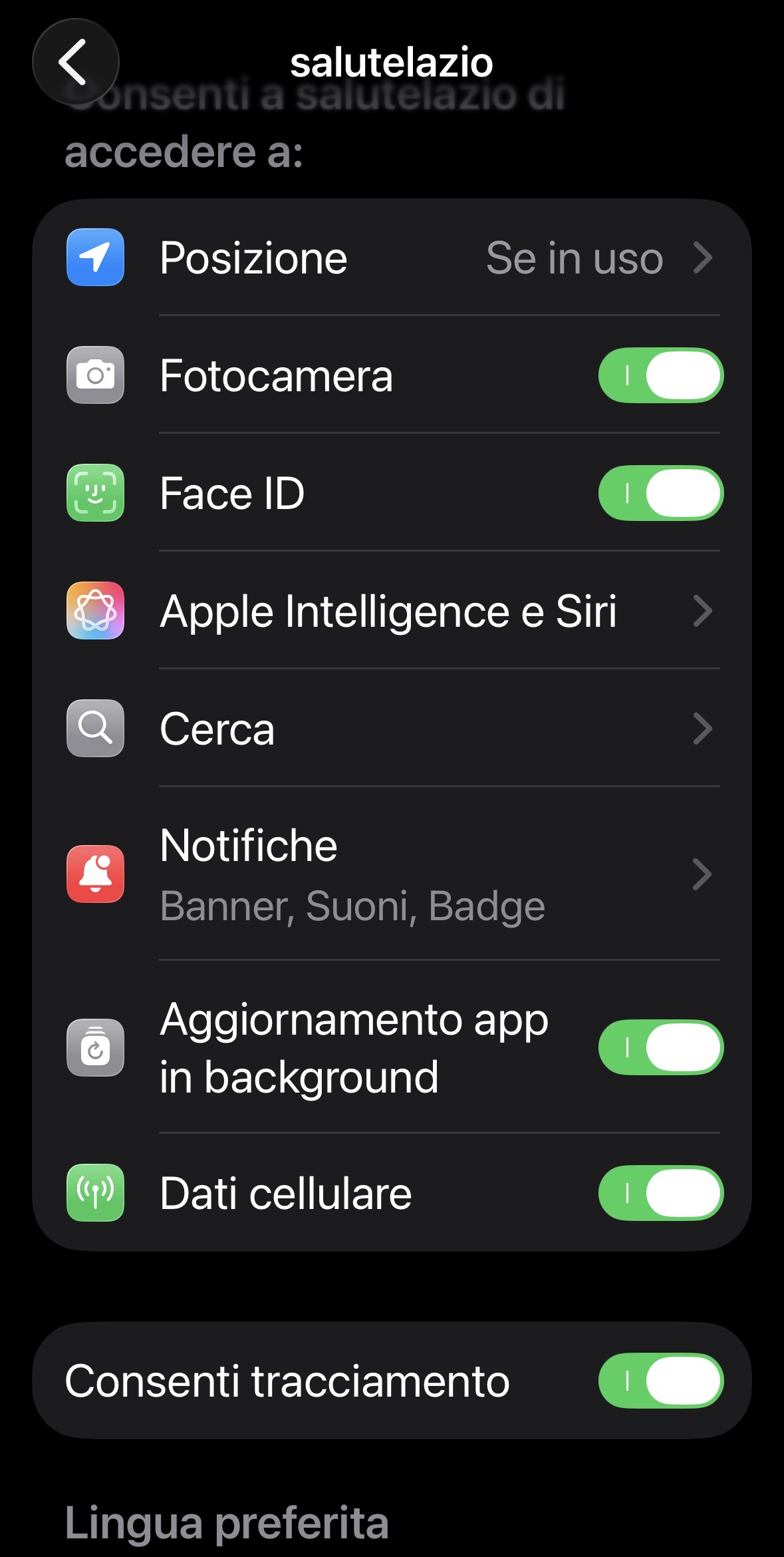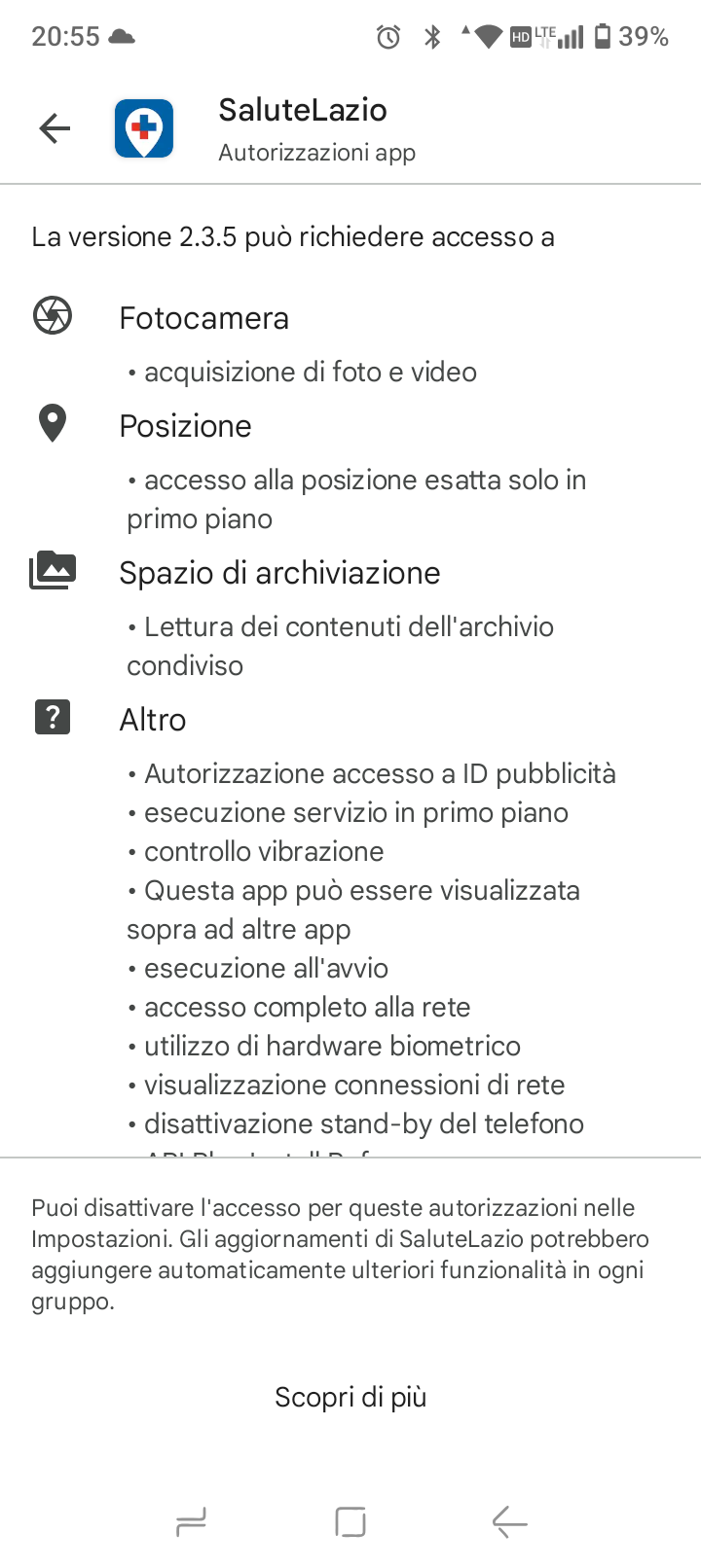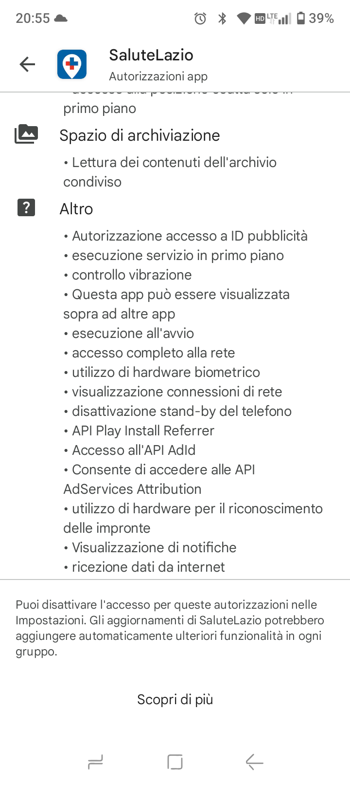 Successivamente controlla se l’app Salute Lazio ha le necessarie autorizzazioni , esiste un elenco sullo store, ti allego i screenshot per Android.